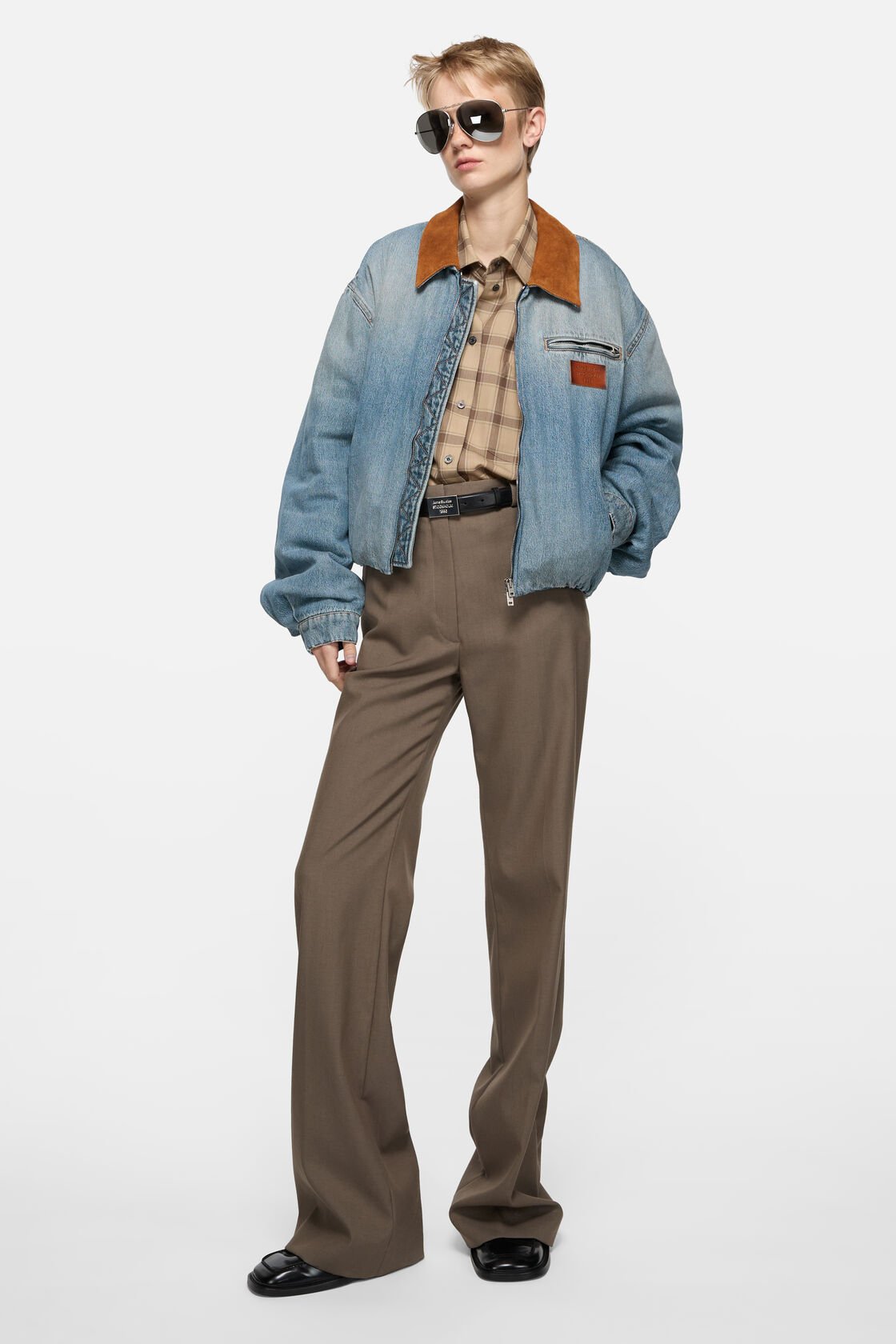 Denim bomber jacket crafted from organic cotton denim with fading and subtle whiskers. Features a suede collar, welt pockets with hidden zips, a gathered waist, and a logo leather patch on the chest. Cut to a regular fit.