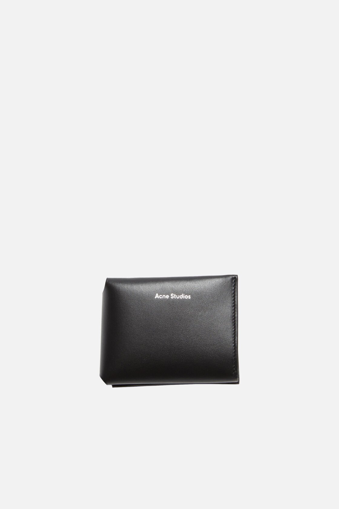 Card Holder crafted from soft leather, foldable in three parts. Features a large interior pocket, an inside coin pocket, and multiple card slots. Finished with a subtly embossed silver Acne Studios logo.