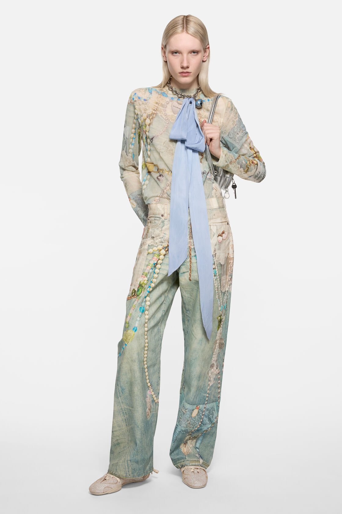 Jeans crafted from cotton canvas with a soft, textured finish, featuring a seasonal trompe-l’œil print of a keychain and lace detailing. 1981 jeans are cut to a loose fit with a low to mid-waist and a wide, baggy leg.